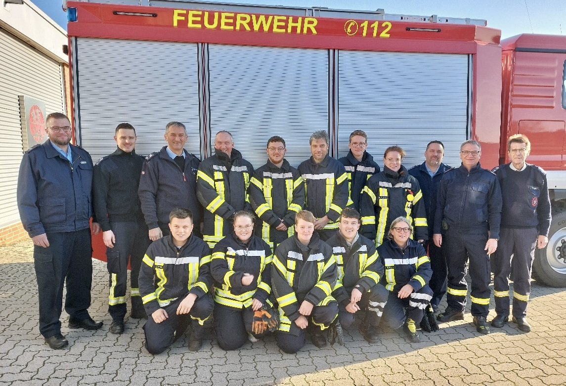 Die erfolgreichen Prüflinge mit den Mitgliedern der Prüfungskommission (unten v.l.n.r.) Julian Streit (OF Ochtmannien), Pia Lohaus (OF Schwarme), Daniela Alkur (OF Engeln), Tim Knoche (OF Süstedt) , Daniela Nußbaum-Müllers (OF Ochtmannien) ; (stehend v.l.n.r.) Kai Mohrmann, Tjark Tecklenborg, Rolf Schweers, Paul Schulz (OF Engeln) Deniz Krüger (OF Bruchhausen-Vilsen) Till Fiedler (OF Kleinenborstel), Jonas Wojack (OF Kleinenborstel), Julia Franke (OF Martfeld) Andreas Steen, Jörg Wichelmann, Frank Tecklenborg