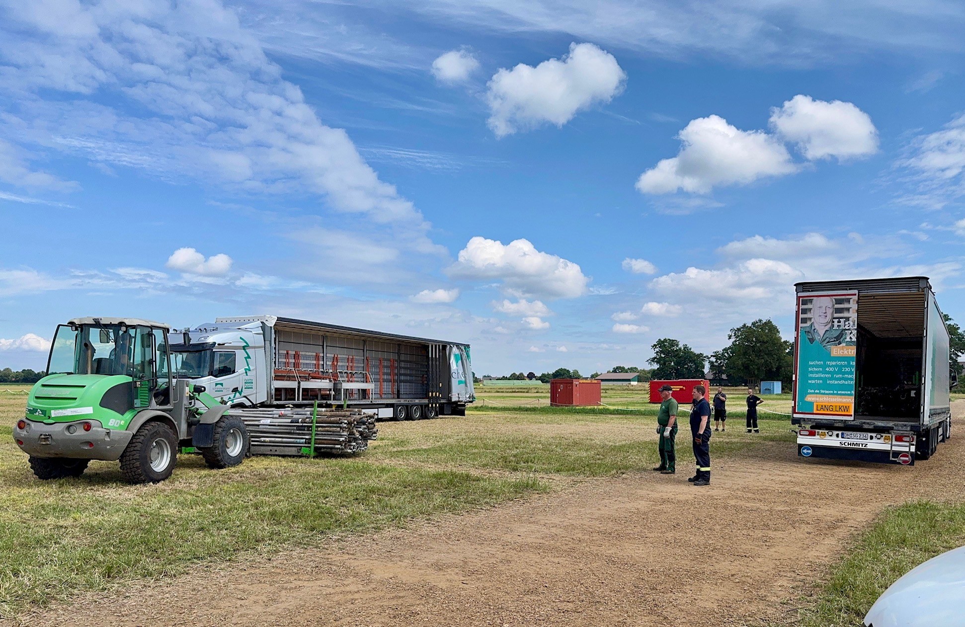 Organisatorisch ist schon viel geregelt. Heute starten auch die handwerklichen Tätigkeiten: Mit mehreren LKWs, Teleskop- oder Radladern und vielen Helfern ging es nach Wagenfeld. Der Abbau des diesjährigen Zeltlagers stand an. Das übernimmt traditionell der Ausrichter des Folgejahres. Auch muss vieles eingelagert werden.