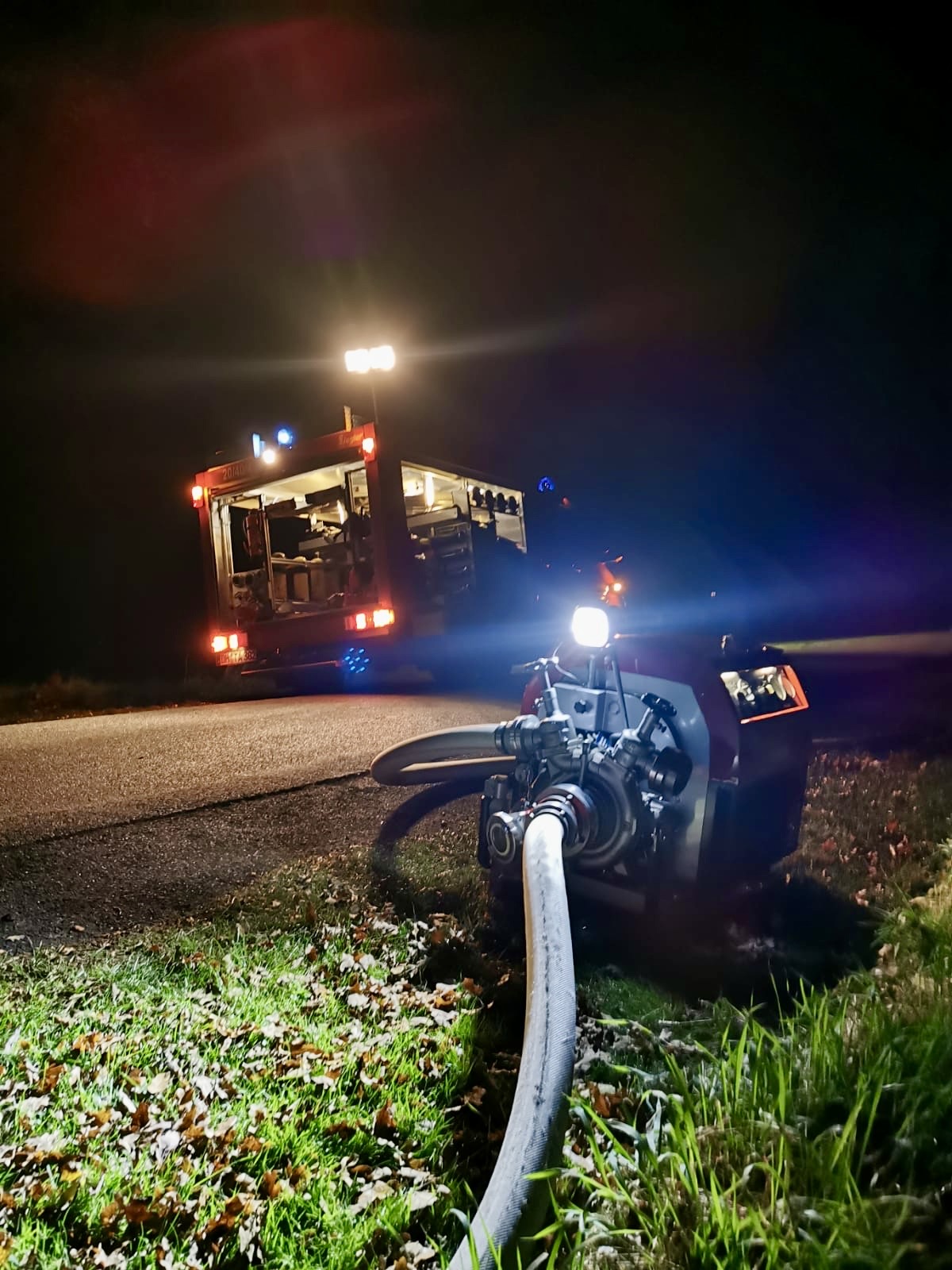Neben der Betreuung der verunfallten Person im PKW durch die ersteintreffenden Einsatzkräfte übernahm eine Gruppe aus Schwarme die technische Rettung. Im Abschnitt 3 wurde eine Wasserversorgung von zwei Unterflurhydranten über eine lange Wegstrecke aufgebaut.