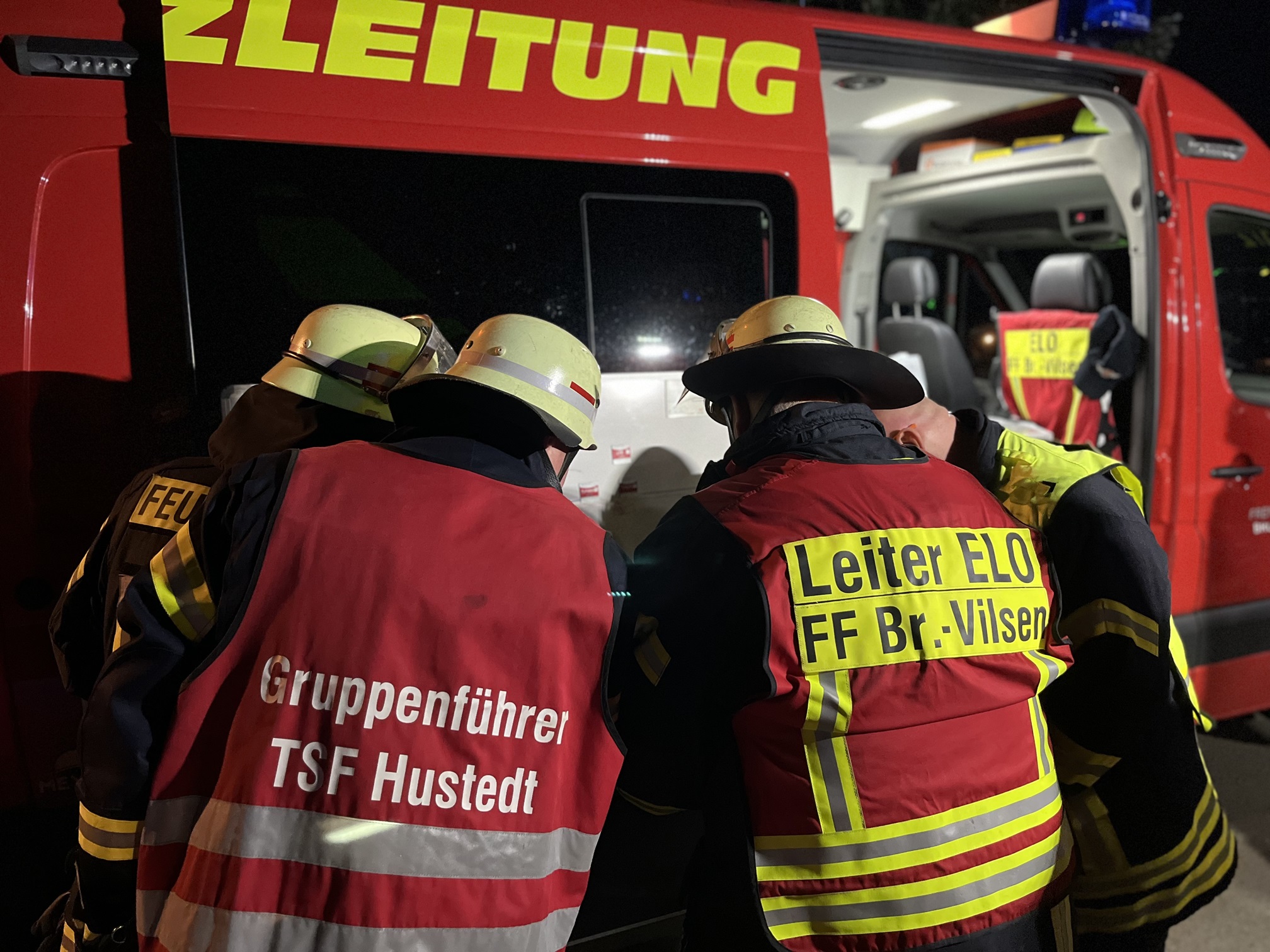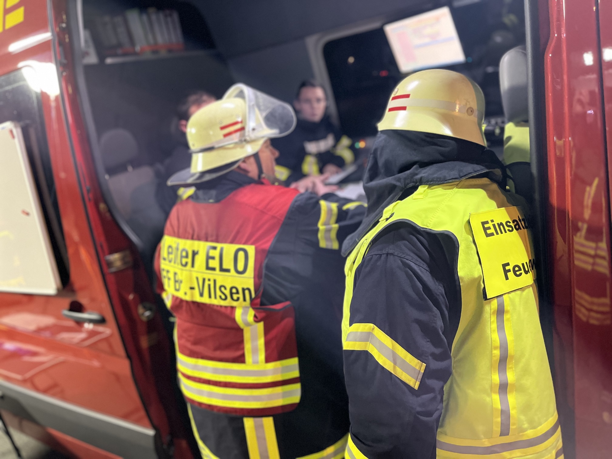 - Der Einsatzleiter bespricht das weitere Vorgehen am Einsatzleitwagen (ELW).