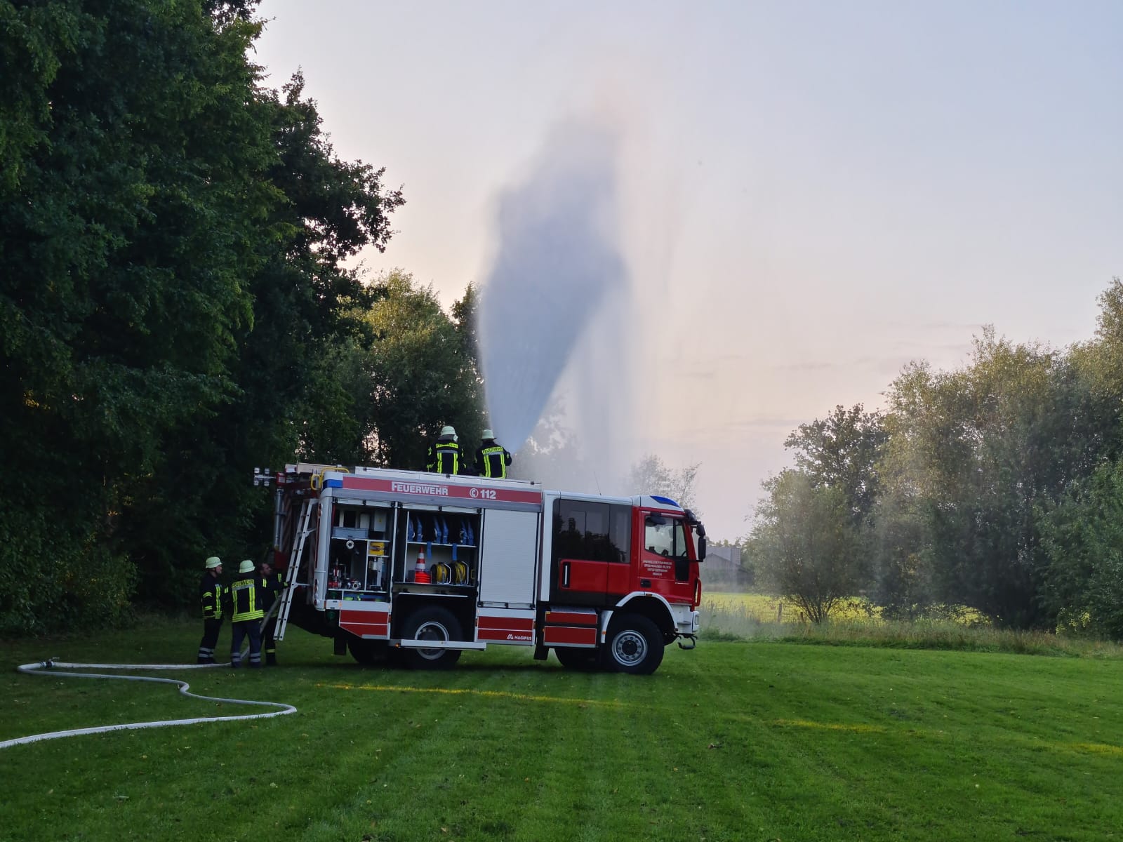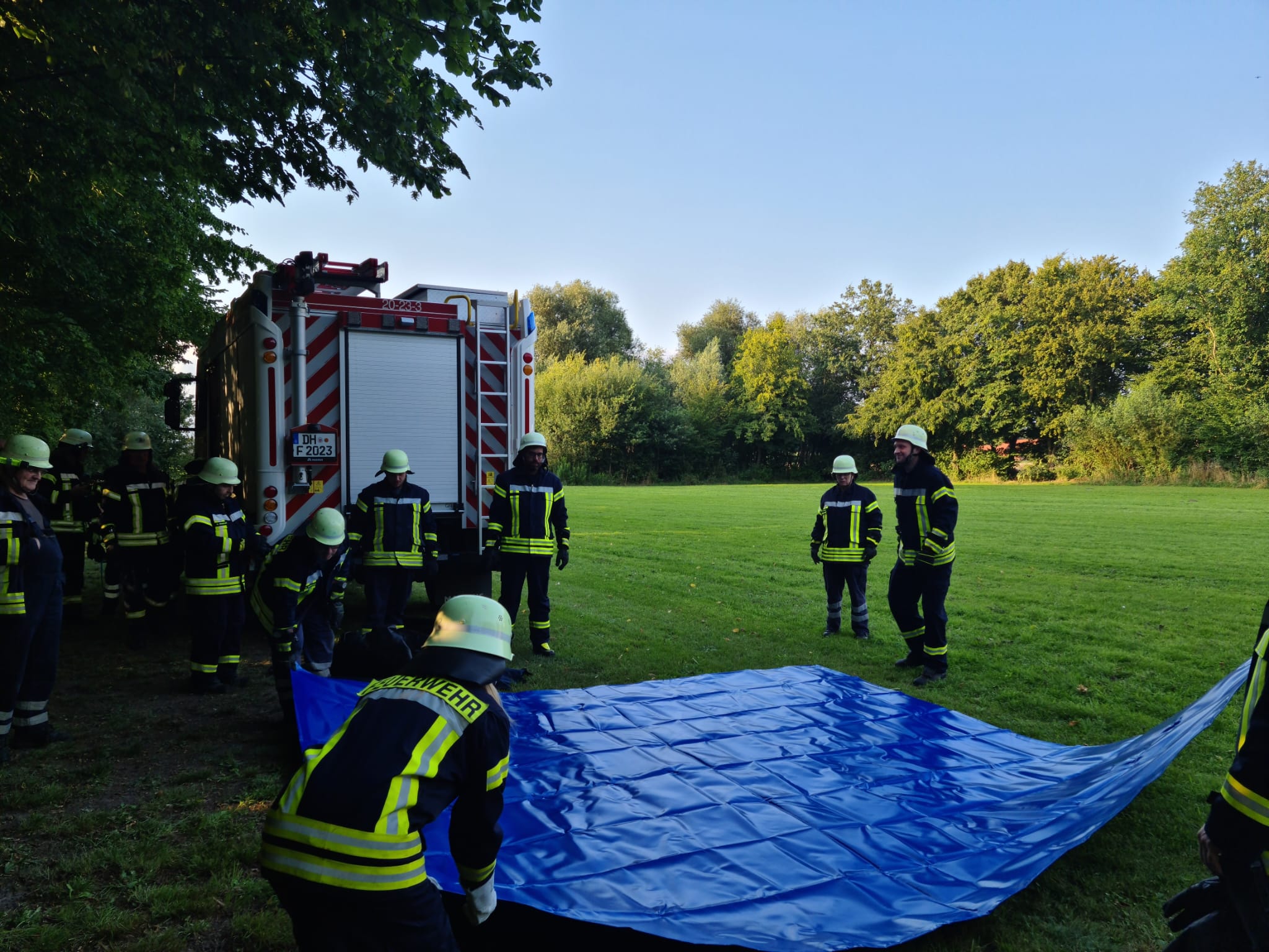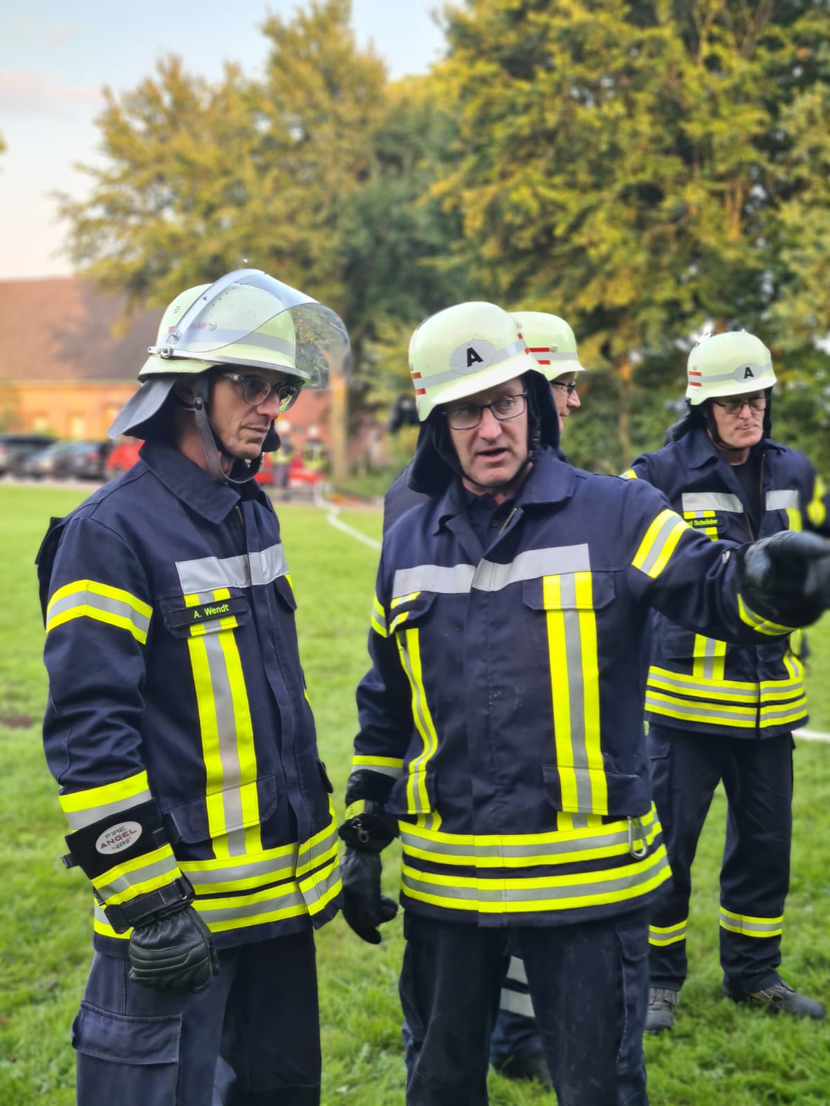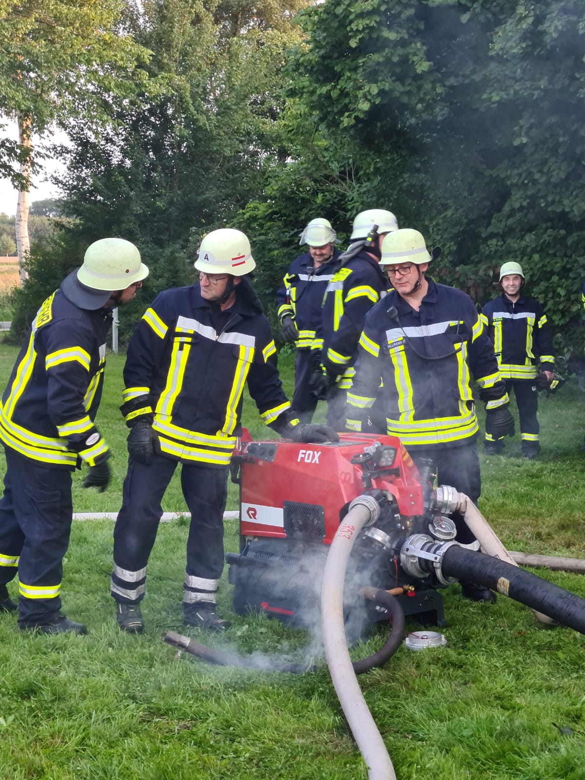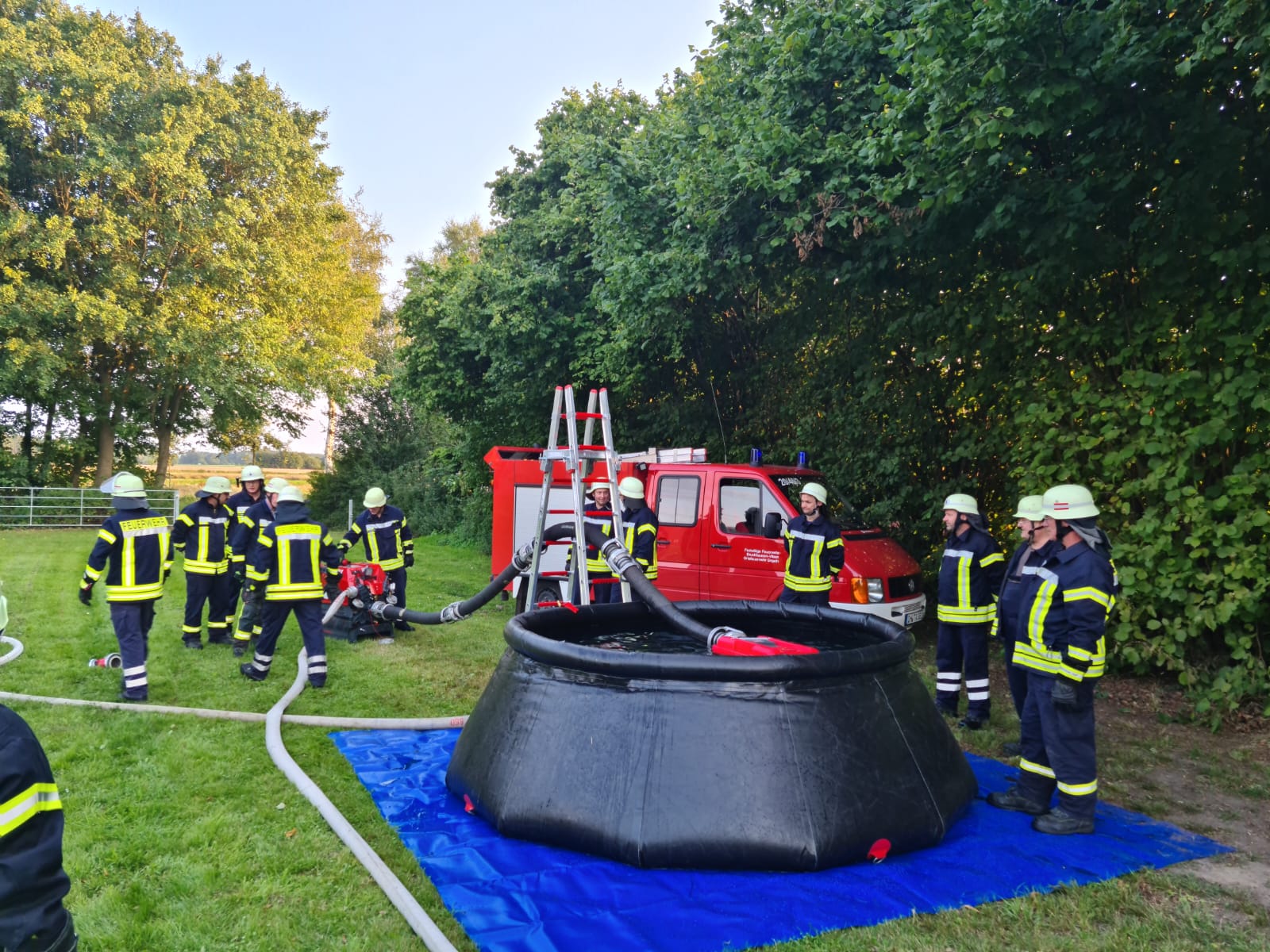 Die meisten größeren Einsätze bearbeiten die Ortsfeuerwehren Ochtmannien und Engeln gemeinsam, Feuerwehr ist Teamarbeit. So ist es sinnvoll, wenn auch zusammen geübt wird, dies hilft einander und die Ausrüstung der Nachbarwehr besser kennenzulernen. Ganz in diesem Sinne wurde der Monatsdienst der Ortsfeuerwehren gemeinsam in Ochtmannien vollführt. Thema war der Brandeinsatz, Schwerpunkt „Wasserförderung lange Wegstrecke“, wobei hier insbesondere der Faltbehälter aus Engeln auf Anregung der Ochtmannier Kameraden im Augenmerk lag. Bei einem Brandeinsatz kann mit diesem Behälter der Wasservorrat gepuffert werden, wenn beispielsweise Tanklöschfahrzeuge von weiter entfernt gelegenen Hydranten die Wasserversorgung sicherstellen oder aufstocken. Im Einsatzgeschehen kann es hierbei dazu kommen, dass beispielsweise die Ortsfeuerwehr Ochtmannien den Faltbehälter aufbauen oder Wasser aus ihm entnehmen muss. Zum Gelingen im Ernstfall soll dieser Übungsdienst beitragen. Nach dem Dienst gab es bei Bratwurst die Gelegenheit zum sozialen und fachlichen Austausch.