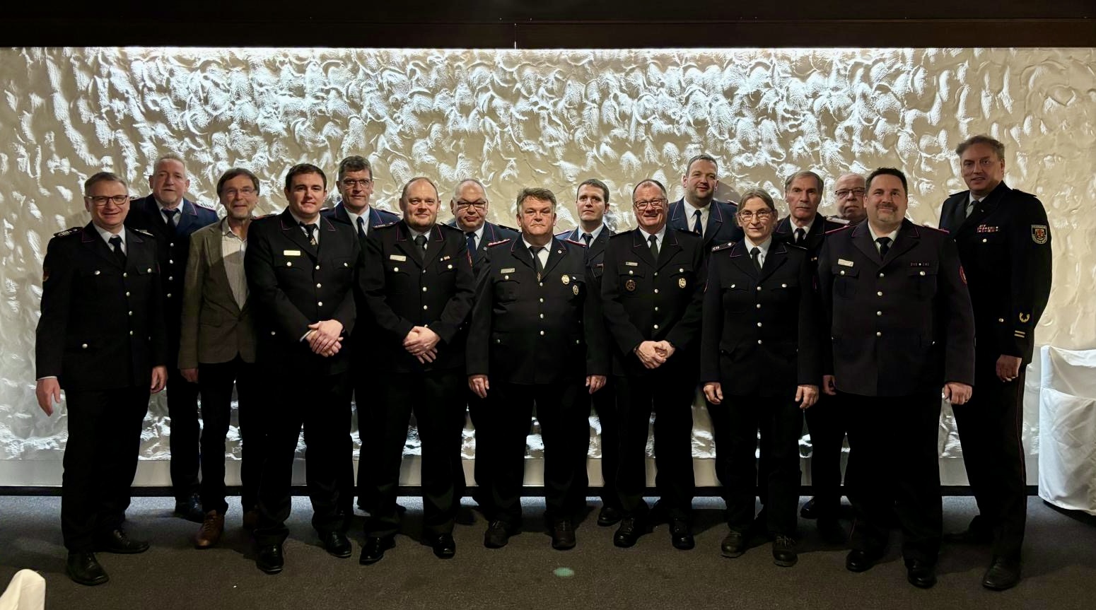 Stellv. Gemeindebrandmeister Jörg Wiechelmann, Jan Franke, Ulf Schmidt, Timo Becker, Stephan Thöle, Mirco Lehning, Jörg Heidorn, Peter Böltau, Frank Zschoche-Wolff, Dieter Laue, Marco Wachendorf, Kerstin Mischok, Dieter Stöckel, Jürgen Karkheck, Ortsbrandmeister Andreas Steen und der stellvertretende Kreisbrandmeister Hartmut Specht (v.l.)
