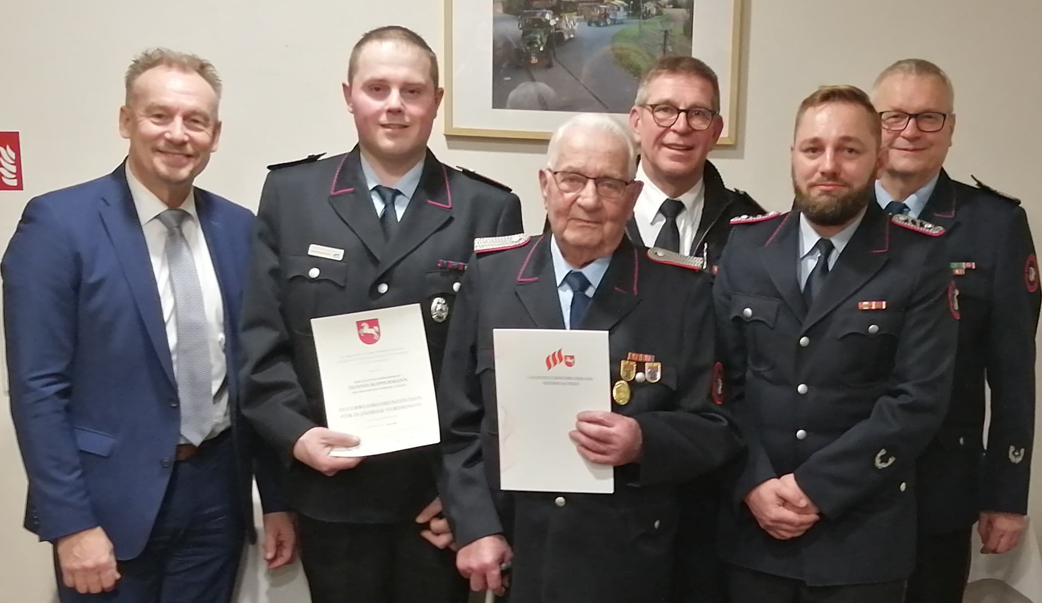 Die Ehrungen für 25 Jahre aktive Mitgliedschaft sowie für 70 Jahre Mitgliedschaft wurden durch Kreisbrandmeister Michael Wessels vorgenommen. Für 25 Jahre aktiven Feuerwehrdienst wurde Dennis Koppermann ausgezeichnet. Für 70 Jahre Mitgliedschaft erhielt der ehemalige Ortsbrandmeister Walter Brauer eine besondere Ehrung.