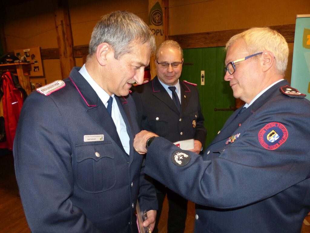 So wurden Ortsbrandmeister Rolf Schweers und der ehemalige Ortsbrandmeister Jens Clausen jeweils für 40 Jahre aktive Mitgliedschaft in der Freiwilligen Feuerwehr geehrt. Beide wurden zudem zum Dienstgrad Brandinspektor befördert.